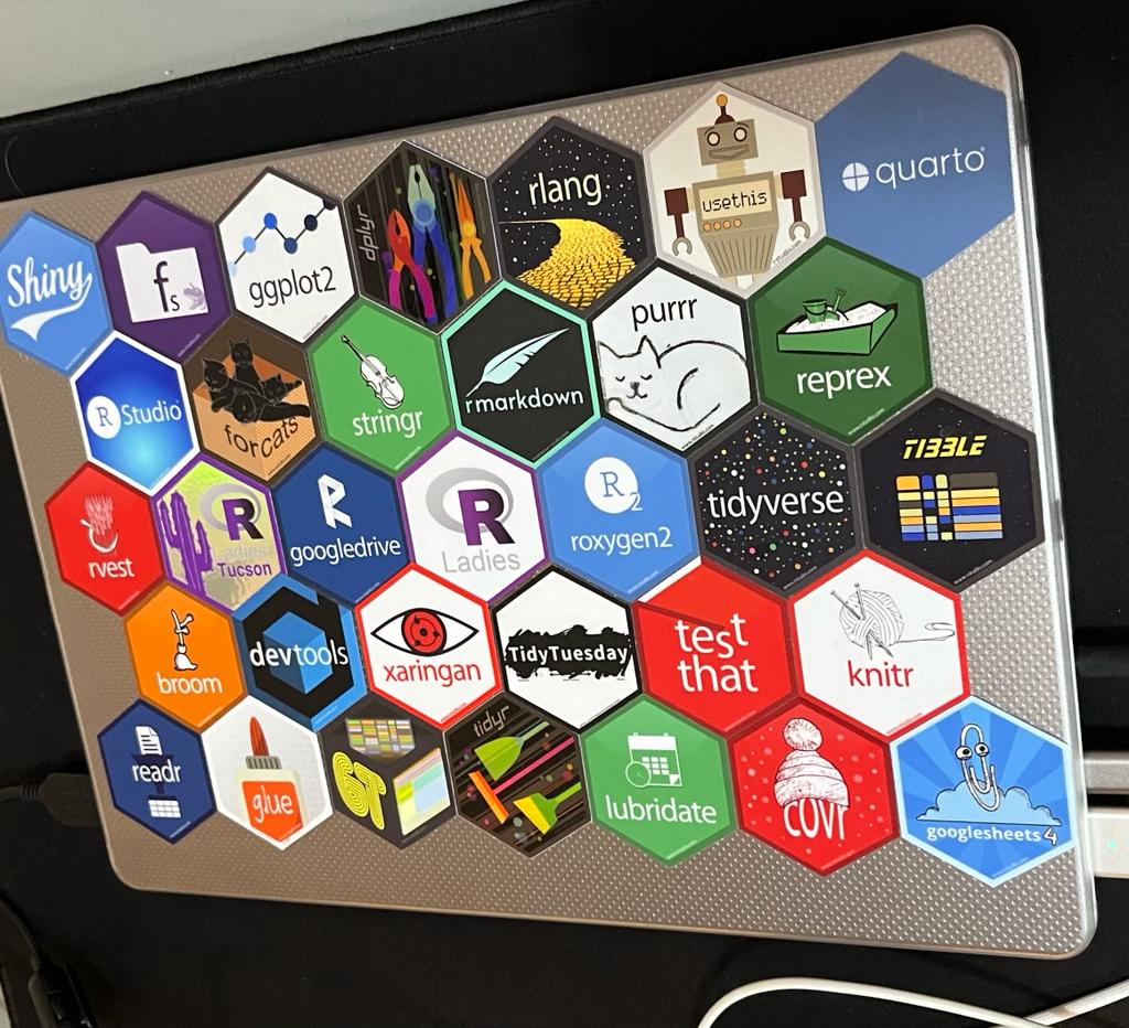 Lots of stickers (my first ones!) and learning in the first day of #rstudioconf2022 .