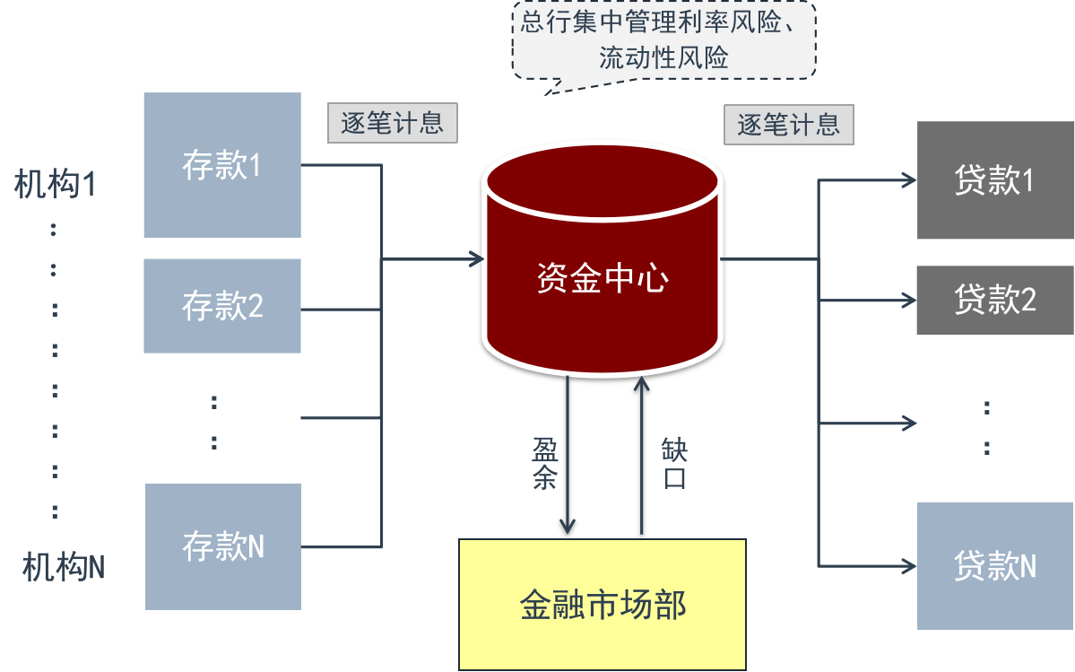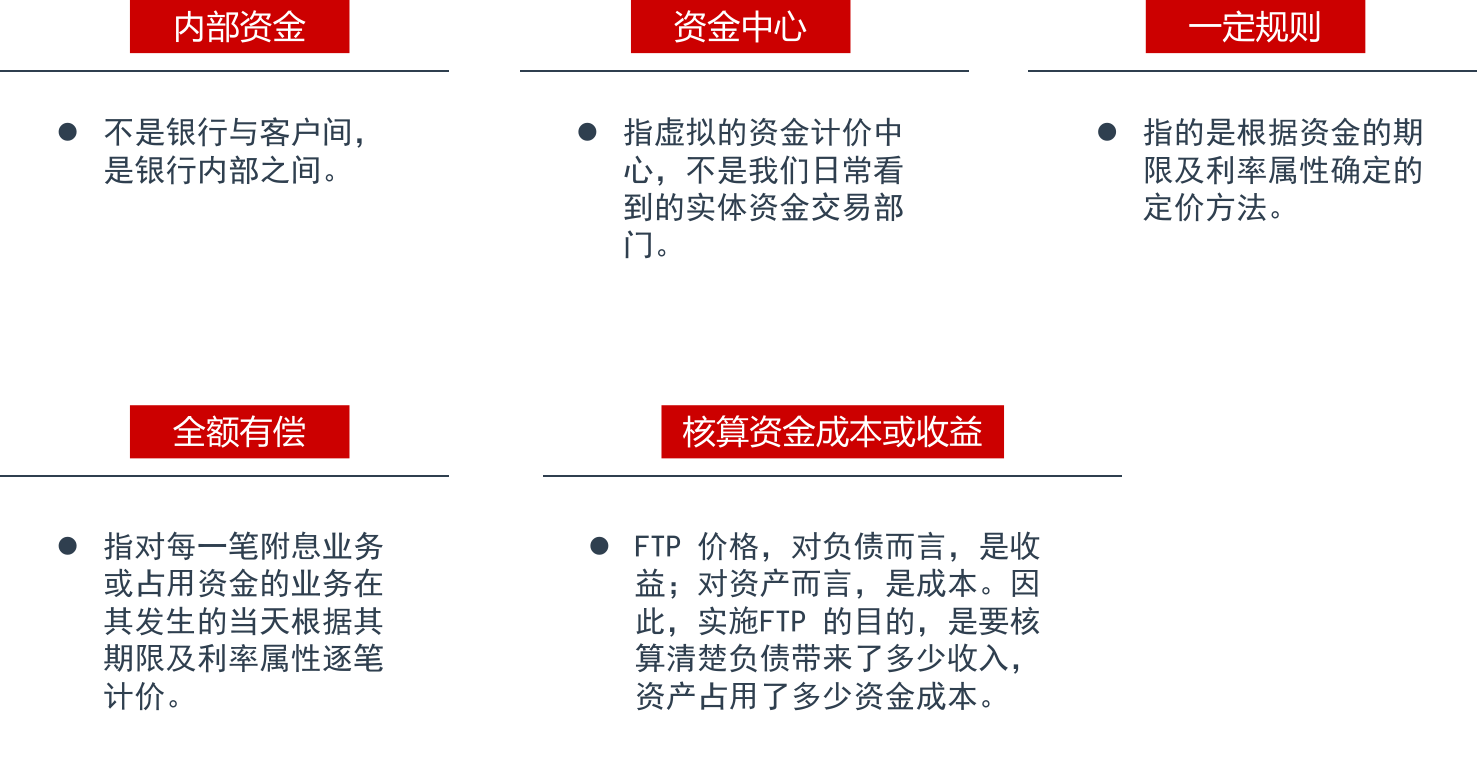 内部资金转移定价(Funds Transfer Pricing ,即FTP)是商业银行内部资金中心与业务经营单位按照一定规则有偿转移资金,以传导经营政策、核算不同业务资金成本和收益、评价不同业务盈利贡献、集中利率风险和流动性风险的资产负债管理手段之一1。